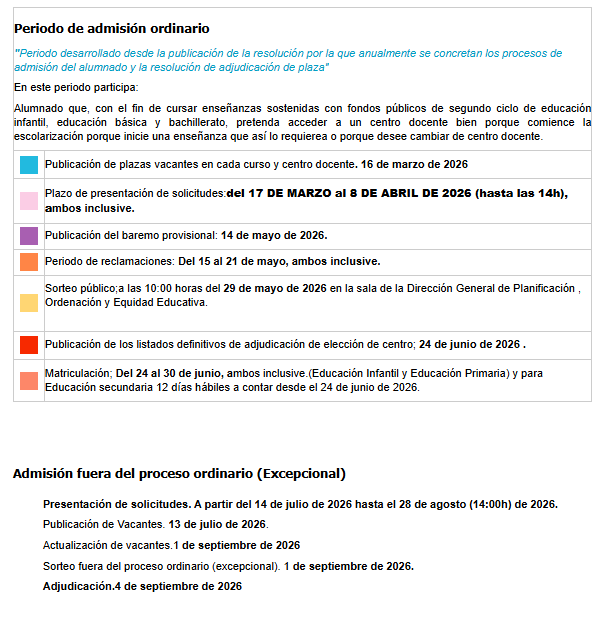 PERIODO NO ORDINARIO "EXCEPCIONALIDAD" Admisión del alumnado fuera del proceso ordinario. 2º ciclo de educación infantil, educación primaria, ESO y Bachillerato. Presentación de solicitudes. A partir del 14 de julio hasta el 28 de agosto (14:00h) de 2026. Publicación de Vacantes. 13 de julio de 2026. Actualización de vacantes.1 de septiembre de 2026. Sorteo fuera del proceso ordinario (excepcional). 1 de septiembre de 2025. Adjudicación. 4 de septiembre de 2026. |